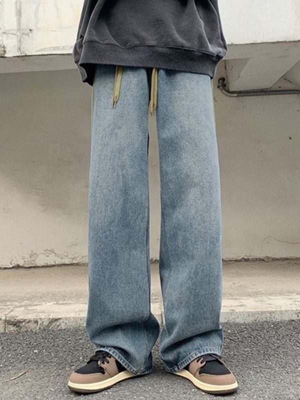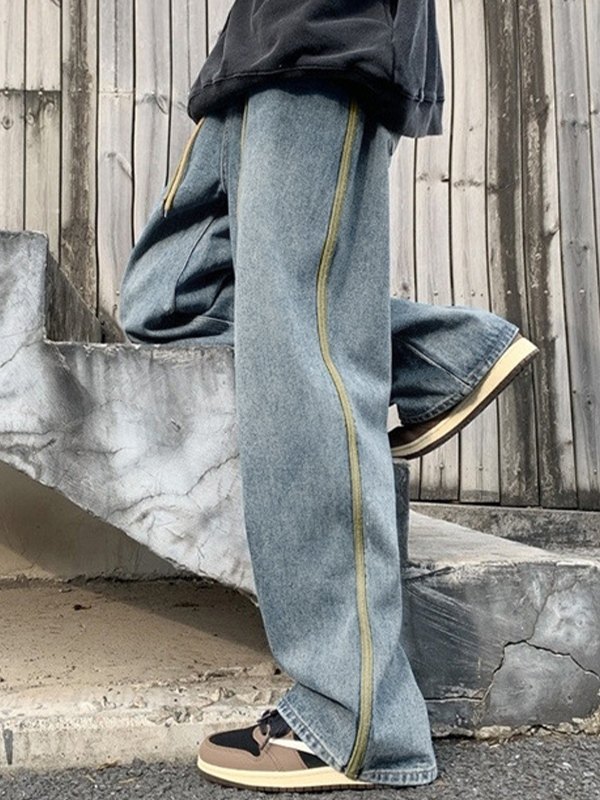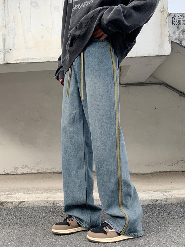 Beschreibung: Diese Jeans im Retro-Skater-Stil hat kontrastierende Streifen Die Seite hat eine verstellbare Taille mit doppeltem Kordelzug und endet mit einem geknöpften Reißverschluss.